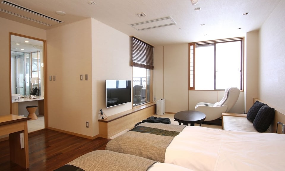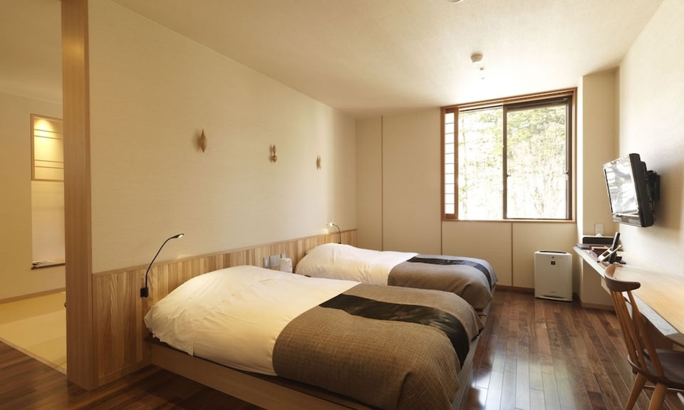 Surrounded by lush nature, luxury Japanese-style hotel Niseko Kombu Onsen Tsuruga Mokunosho features a hot spring bath and rooms with mountain views and free Wi-Fi, some with a private open-air bath.