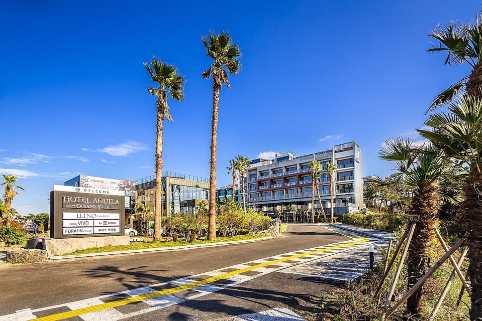 Aguila Hotel Jeju Oceano Suite 酒店位于济州岛西北海岸,拥有无边泳池和俯瞰大海的屋顶露台。